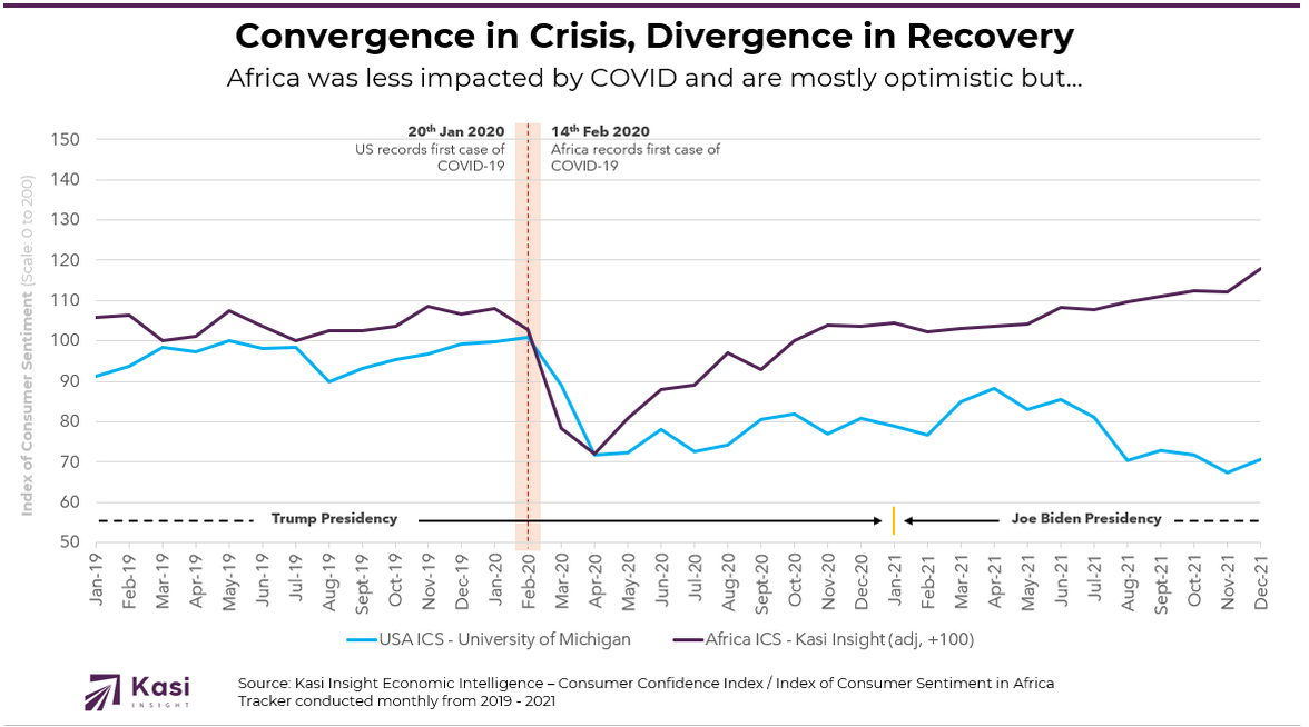This convergence highlighted the universal impact of the pandemic on consumer confidence and economic activity, despite vast differences in the economic structures and capabilities of the two regions. Both regions faced severe economic shocks, including job losses, reduced disposable income, and supply chain disruptions. From a health perspective, the fear of the unknown dominated public sentiment globally, affecting both advanced healthcare systems in the U.S. and under-resourced systems in Africa. Lastly, the global decline in oil prices disproportionately affected Africa’s oil-dependent economies and the U.S. shale industry.